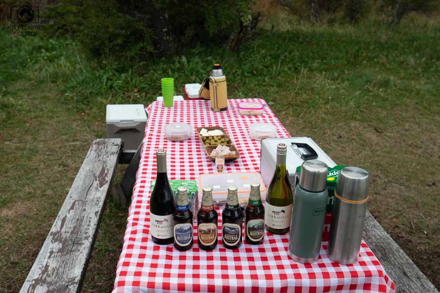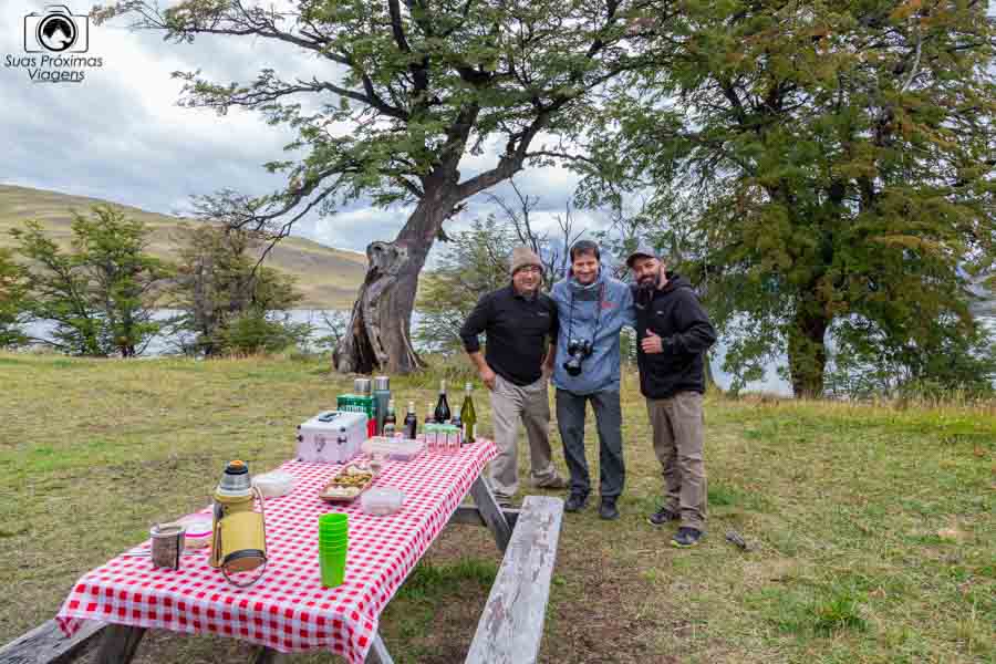 Antes do passeio, perguntam sobre eventuais restrições alimentares e alergias. Providenciam tudo com o maior carinho e, sempre que o passeio permite, preparam uma bela mesa, com direito a toalhinha xadrez, em um dos mirantes com vista privilegiada. Para você ter uma ideia, como opção de bebida havia água, sucos, refrigerantes, cervejas artesanais e até vinhos. Além de aperitivos, recebemos um delicioso sanduíche gourmet, sobremesa e docinhos.