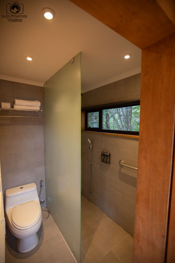Aliás, a cama parecia nos abraçar. É sério, não estamos exagerando! O colchão tem densidade perfeita e os lençóis certamente têm muitas centenas de fios. O toque para deixar a noite de sono ainda mais perfeita é um domo de acrílico transparente sobre a cama. Em noites abertas, é possível observar o céu super estrelado. Com chuva, dormir ao som da água batendo no acrílico é extremamente relaxante.