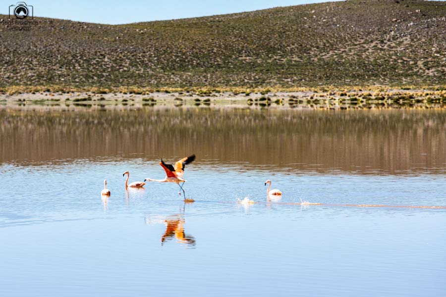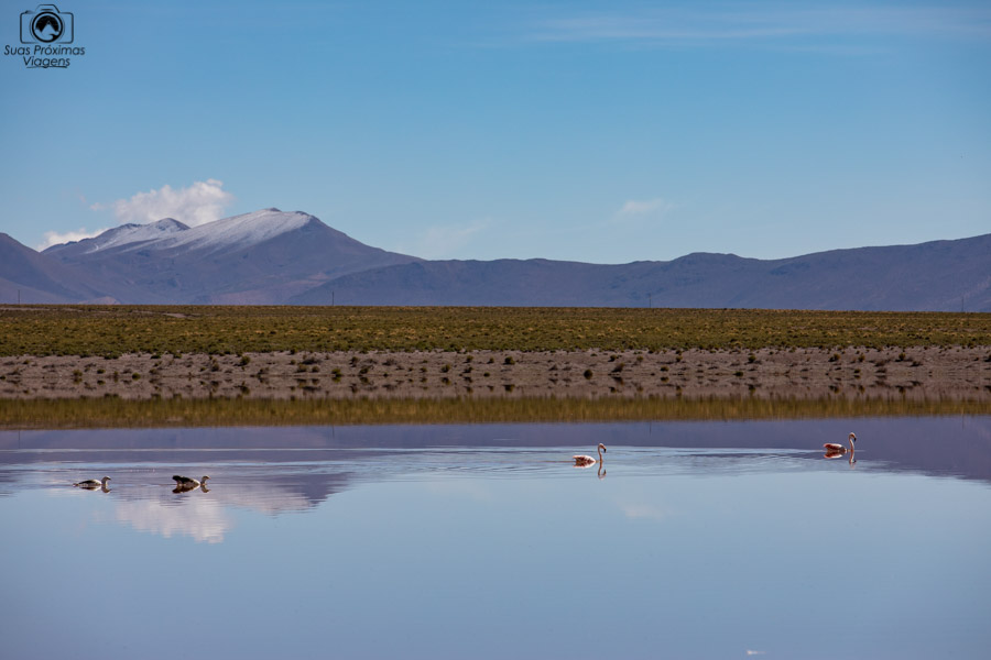 No caminho, o próximo ponto turístico será a Laguna Vinto. Mais um cenário super fotogênico, na melhor combinação lagoa, vulcões nevados e flamingos. Uma parada rápida, mas que rende lindas fotos.